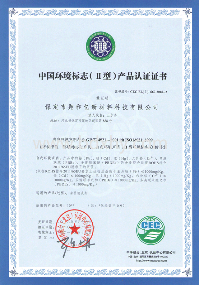 我公司于2018年5月通過中環(huán)聯(lián)合(北京)認證中心對我公司嚴格審查,認證通過并獲得《中國環(huán)境標志(II型)產(chǎn)品認證證書》—認證產(chǎn)品名稱:潤版液,油墨清洗劑。
